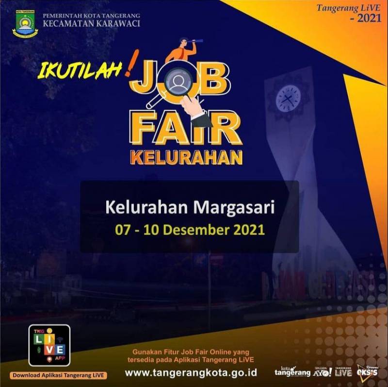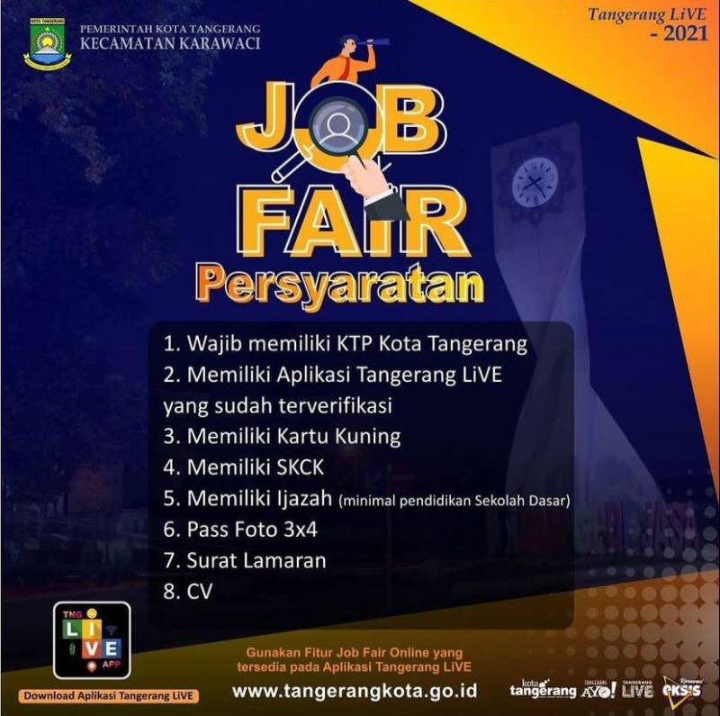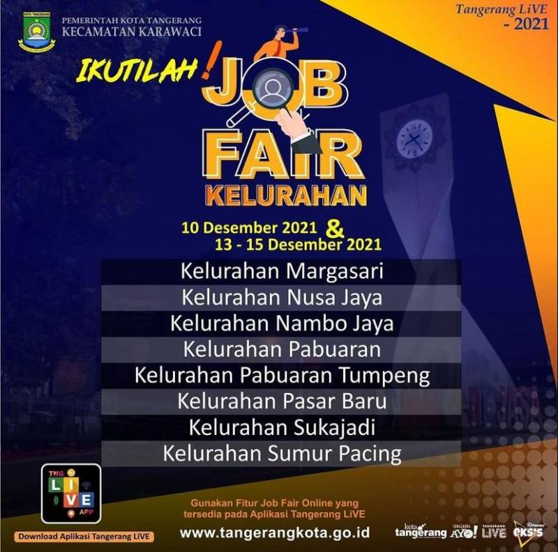 Para pencari kerja khususnya warga Kecamatan Karawaci. Jangan lewatkan kesempatan ini, catat jadwalnya, siapkan berkasnya, dan ikuti job fair tingkat kelurahan di 16 kelurahan di Kecamatan Karawaci.