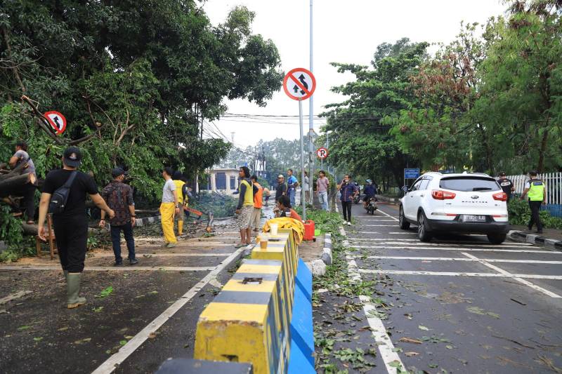 Hujan lebat disertai angin kencang baru saja melanda Kota Tangerang, hingga mengakibatkan sejumlah pohon tumbang, Kamis (23/12/21). Reaksi cepat penanganan, ratusan petugas gabungan langsung menyebar ke sejumlah titik kejadian.