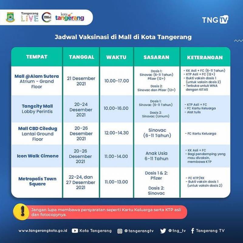 Belanja sambil vaksin di Mall? bisa banget lho.Berikut adalah jadwal vaksinasi yang ada di Mall di Kota Tangerang!Syarat dan ketentuan berlaku ya.