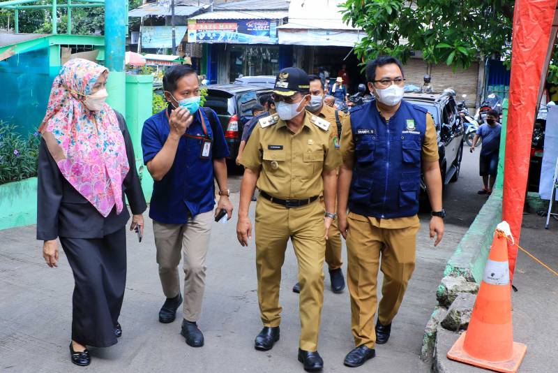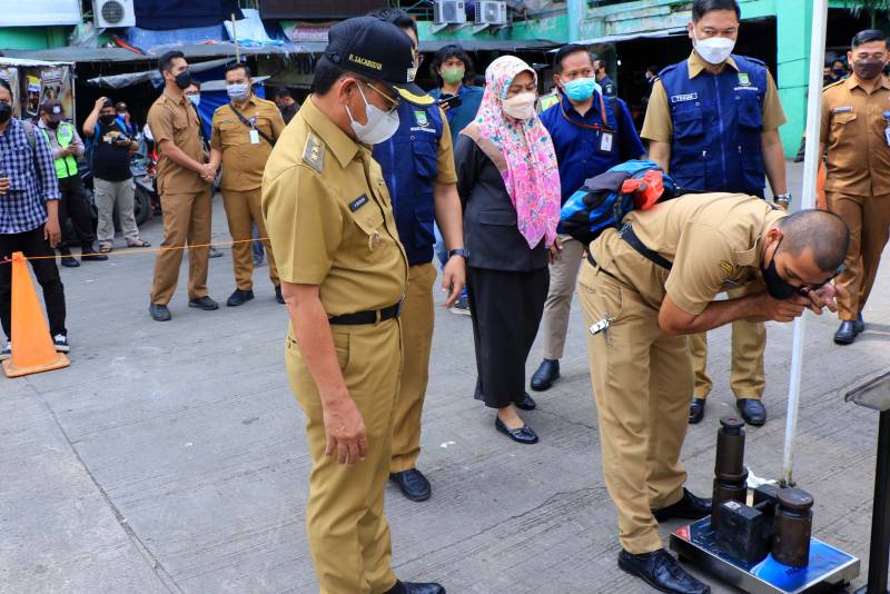 Wakil Wali Kota Tangerang H. Sachrudin bersama Kepala Bidang Perdagangan Disperindagkop UKM Shandy Sulaeman dan Dirut PD Pasar Titien Mulyati hadir meninjau pendistribusian minyak goreng curah kepada para pedagang Pasar anyar.