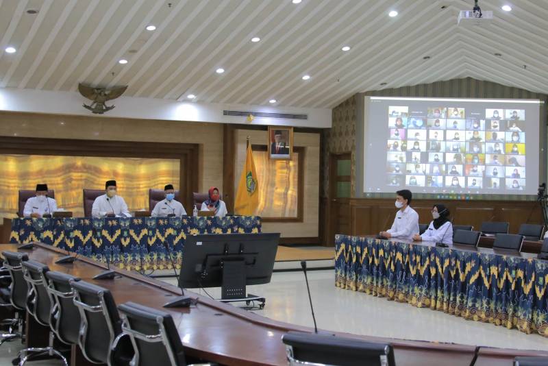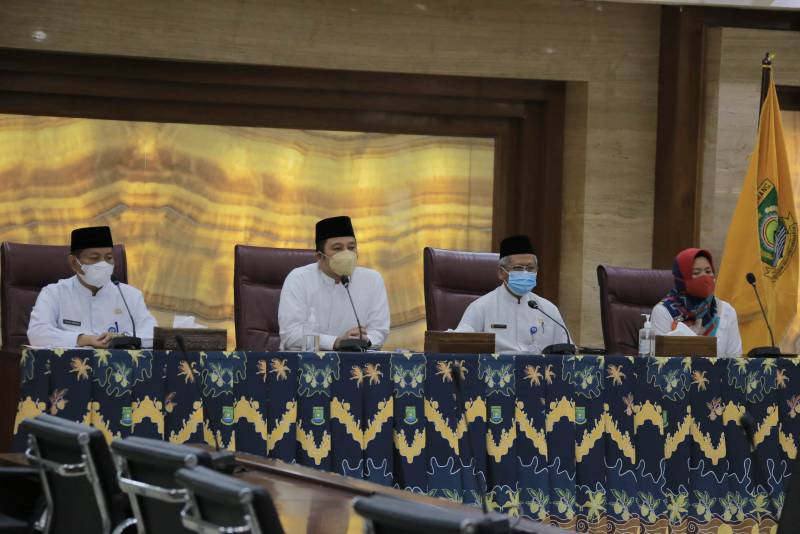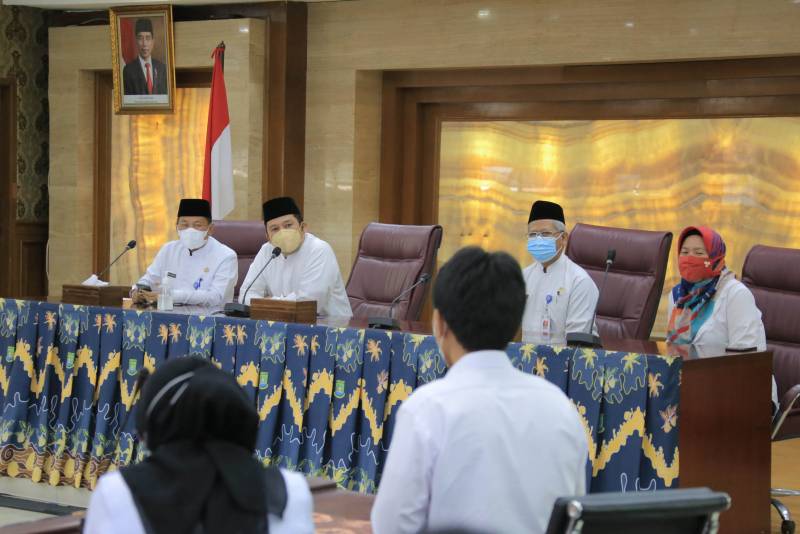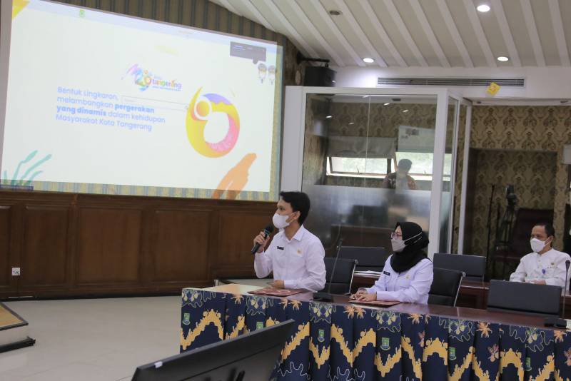 Wali Kota Tangerang H. Arief R. Wismansyah didampingi Sekretaris Daerah Herman Suwarman menyerahkan secara simbolis Surat Keputusan (SK) Pengangkatan kepada 118 Calon Pegawai Negeri Sipil (CPNS) Tahun 2021 Pemerintah Kota Tangerang yang diadakan secara daring dan luring di Pusat Pemerintahan Kota Tangerang, Jumat (08/04).