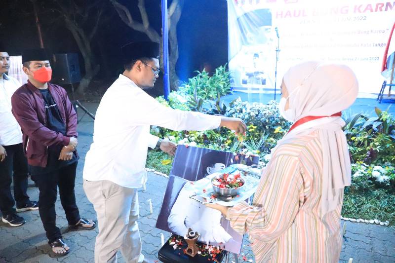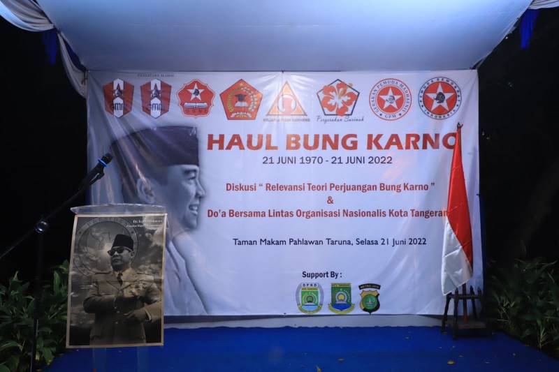 Memperingati Haul Bung Karno ke-52 tahun, sederet organisasi nasionalis di Kota Tangerang menggelar doa bersama, di TMP Juang Taruna Tangerang, Selasa (21/6/22). Berlangsung secara hikmat dan meriah, haul Bung Karno diawali dengan doa tahlil bersama.