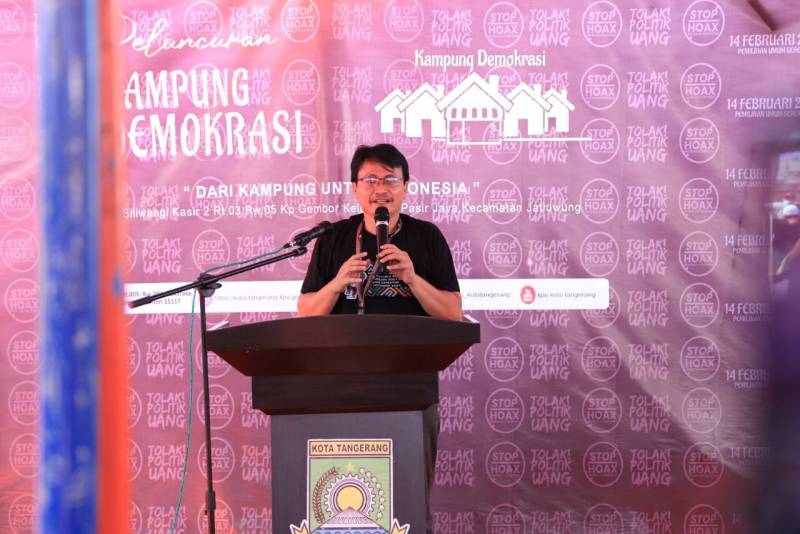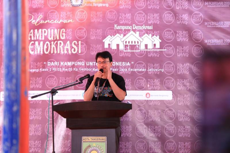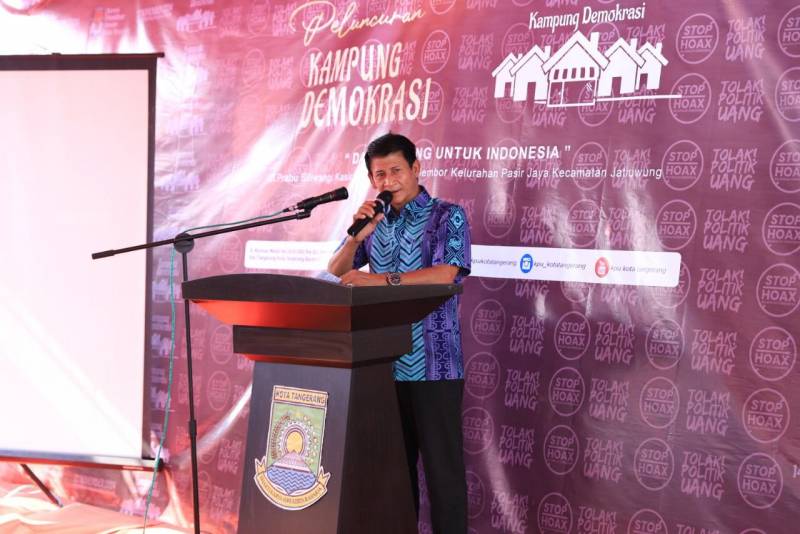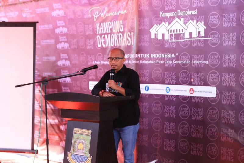 Dalam rangka mengedukasi masyarakat Kota Tangerang terkait persiapan Pemilihan Umum (Pemilu) tahun 2024, Komisi Pemilihan Umum (KPU) Kota Tangerang meluncurkan Kampung Demokrasi, di RW 05, Kelurahan Pasir Jaya, Kecamatan Jatiuwung, Kota Tangerang, Sabtu (2/7/22).