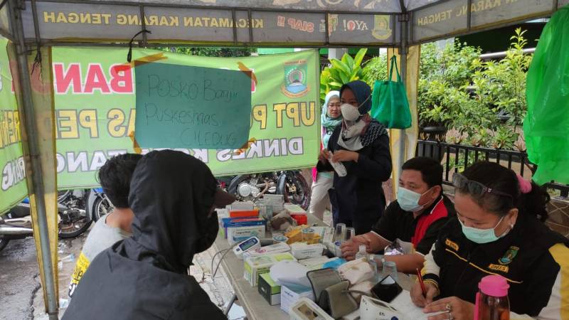 Cepat tanggap akan kondiri banjir yang melanda Kota Tangerang, Sabtu (16/7/22). Pemerintah Kota (Pemkot) Tangerang melalui sederet OPD terkait turun ke lapangan untuk melakukan penanganan. Tak terkecuali Dinas Kesehatan yang kini sudah membangun enam Posko Kesehatan di lokasi banjir, untum memberikan pertolongan medis kepada korban banjir.