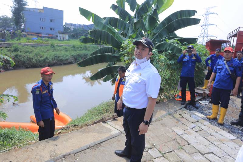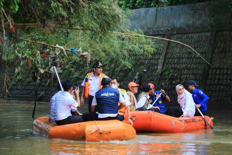 Wali Kota Tangerang H. Arief R. Wismansyah bersama jajaran Dinas Pekerjaan Umum dan BPBD Kota Tangerang menyisir kali angke. Dengan menggunakan perahu karet Wali Kota mulai menyisir dari wilayah Duren Villa hingga Bendungan Polor yang berada di Kelurahan Petir perbatasan Kota Tangerang dengan Jakarta Barat, Rabu (28/9/22).