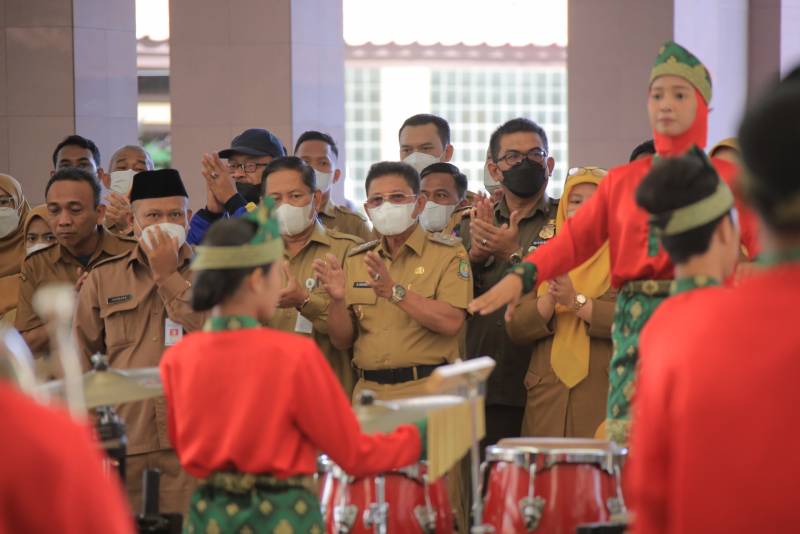 Usai apel pagi, Sachrudin bersama kepala OPD dan pegawai Pemkot Tangerang berkesempatan menyaksikan sesi gladi tim Drumband Kota Tangerang yang akan menjadi kontingen dalam cabang olahraga Drumband di Porprov VI Banten mendatang.