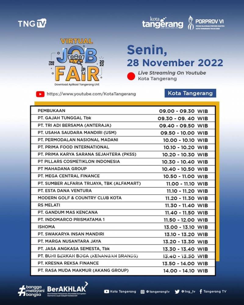 Hallo jobseeker, kali ini @disnaker_kotatangerang kembali menggelar Virtual Job Fair yang direschedule menjadi hari Senin, 28 November 2022. Diadakan secara Live Streaming di Channel Youtube Kota Tangerang.