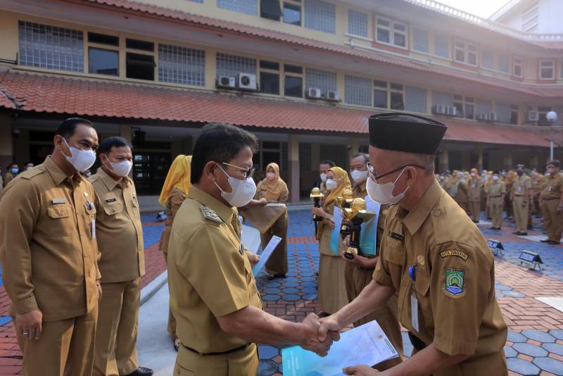 Wakil Wali Kota Tangerang H. Sachrudin secara langsung memberikan penghargaan Adhiwiyata dan Sekolah Sehat Tingkat Provinsi Banten kepada perwakilan kepala sekolah penerima penghargaan.