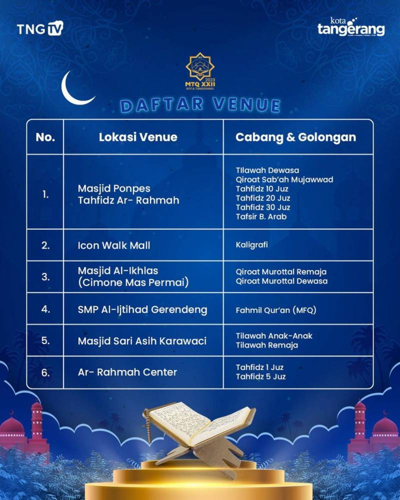 Perhelatan Musabaqoh Tilawatil Quran (MTQ) Kota Tangerang ke-XXII segera dimulai. Rangkaian kegiatan dimulai dengan pembukaan di Masjid Raya Al-Azhom, Sabtu (14/01/23). Pada tahun ini, tema yang diusung adalah "Membumikan Al-Quran dalam Mewujudkan Kota Tangerang yang Berakhlaqul Karimah," dan tuan rumah gelaran MTQ kali ini adalah Kecamatan Karawaci.