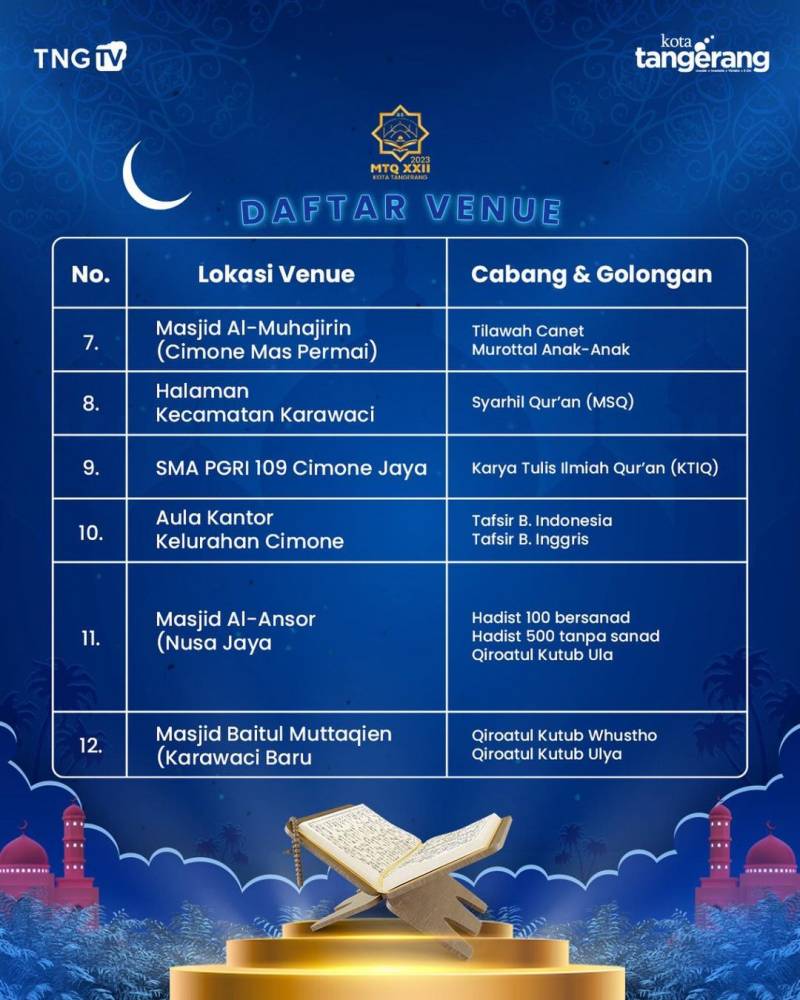 Berikut adalah daftar lomba dan lokasi kegiatan selama MTQ tingkat Kota Tangerang ke-XXII:
