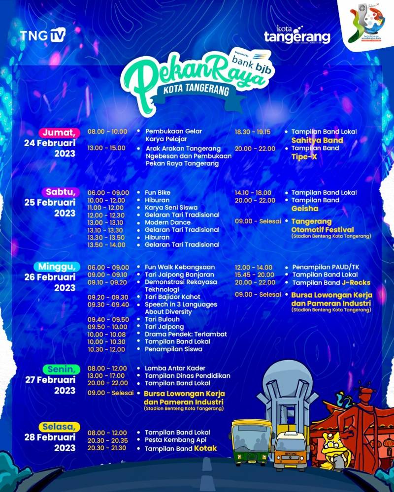Kepala Disbudpar, Kota Tangerang, Rizal Ridolloh mengungkapkan Pekan Raya Kota Tangerang yang digelar lima hari penuh, akan mendatangkan artis-artis terkenal. Diantaranya, Band Tipe-X pada Jumat (24/2), Geisha Band pada Sabtu (25/2), Jrock Band pada Sabtu (26/2), dan Kotak Band pada Selasa (28/2).