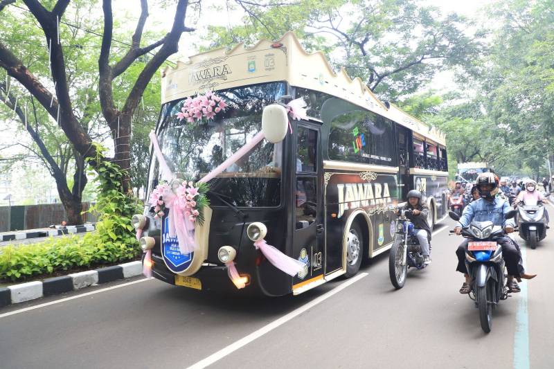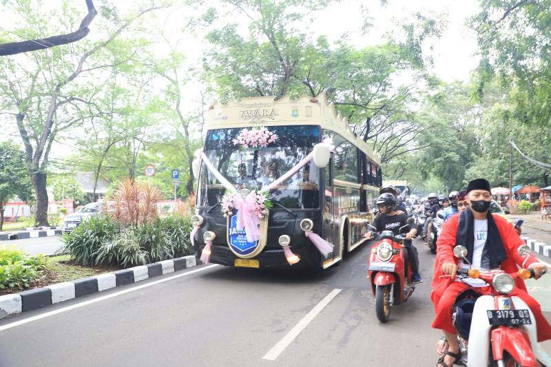 "Nantinya mereka akan di arak dengan naik bis Jawara mengelilingi kota, setelah itu akan ada penerimaan pengantin dengan prosesi palang pintu, dan baru pasangan akan dibawa ke pelaminan yang disiapkan untuk nantinya Wali Kota dapat memberikan ucapan selamat kepada para pengantin dan pemberian bingkisan," ujar Jatmiko.