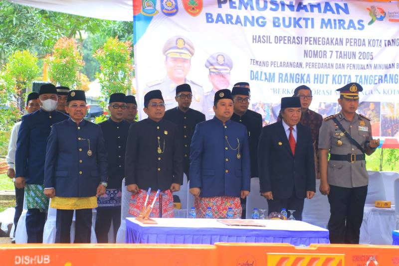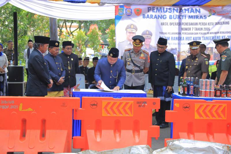 Barang bukti miras yang merupakan hasil dari operasi terpadu yang dilakukan oleh Satuan Polisi Pamong Praja (Satpol PP) dengan Polres Metro Tangerang Kota dan juga dukungan dari Kodim 0506 Tangerang tersebut, dimusnahkan dengan cara digilas menggunakan alat berat dan disaksikan langsung oleh Wali Kota Tangerang, H. Arief R Wismansyah didampingi Wakilnya, H. Sachrudin beserta unsur Forum Komunikasi Pimpinan Daerah (Forkopimda) Kota Tangerang, serta turut hadir pula Penjabat (Pj) Gubernur Provinsi Banten, Al Muktabar.