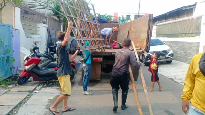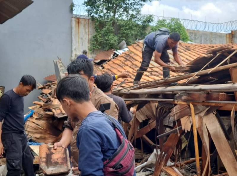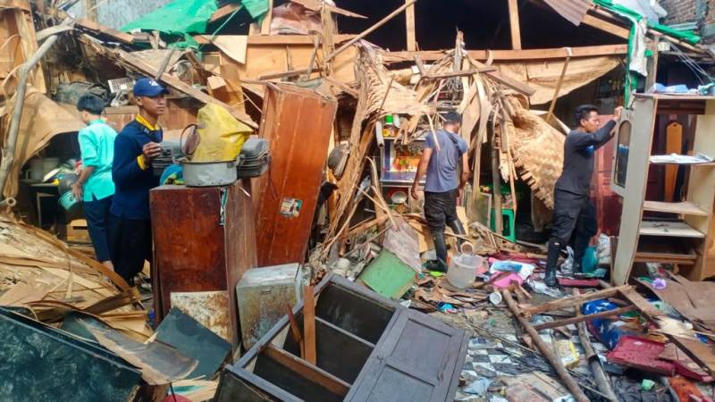 Dimana petugas yang diturunkan melakukan evakuasi penghuni rumah, serta membersihkan puing-puing yang berserakan akibat robohnya rumah semipermanen, yang didominasi terbuat dari bambu-bambu.