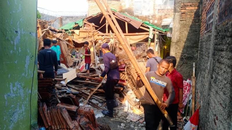 Sebuah rumah semipermanen di Jalan Sutopo, Kelurahan Sukarasa, Kecamatan Tangerang, Kota Tangerang roboh, pada Jumat (10/3/23) siang. Pemerintah Kota (Pemkot) Tangerang melalui OPD terkait dan jajaran Kecamatan Tangerang langsung bertindak cepat, melakukan penanganan di lokasi kejadian.