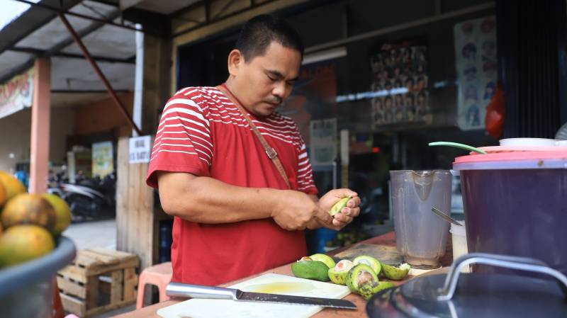 “Berjualan sudah 15 tahun kurang lebih. Ini usaha pertama saya dan memilih ini karena melihat suasana dan cuaca di daerah sini sepertinya cocok untuk berjualan jus. Di sini, yang paling favorit itu alpukat dan jambu. Perbedaan dengan tempat lain, di sini itu lebih kental. Jadi, buahnya lebih banyak dibandingkan air atau esnya,” kata Riswan.