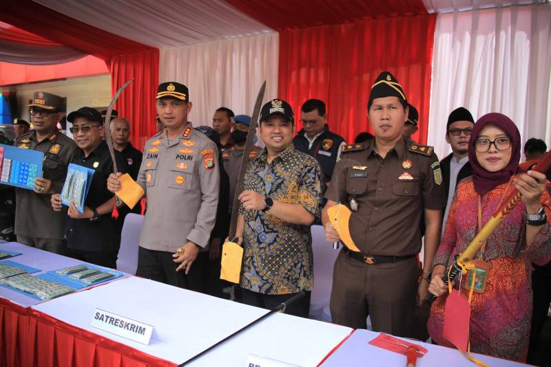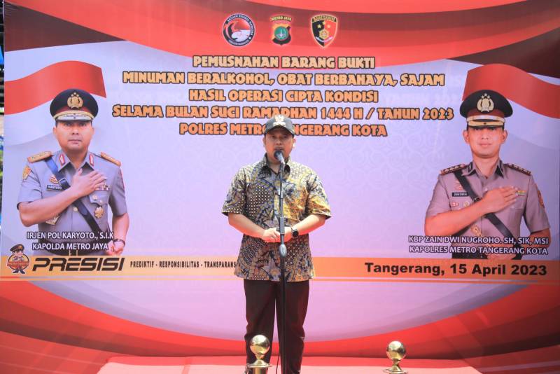 Wali Kota Tangerang, H. Arief R Wismansyah, menghadiri kegiatan Pemusnahan Barang Bukti Minuman Beralkohol Hasil Operasi Cipta Kondisi Selama Bulan Suci Ramadan 1444 H oleh Kepolisisan Resor (Polres) Metro Tangerang Kota betempat di Lapangan Apel Polres Metro Tangerang Kota, Sabtu (15/04).