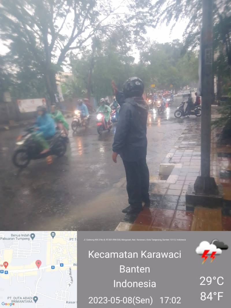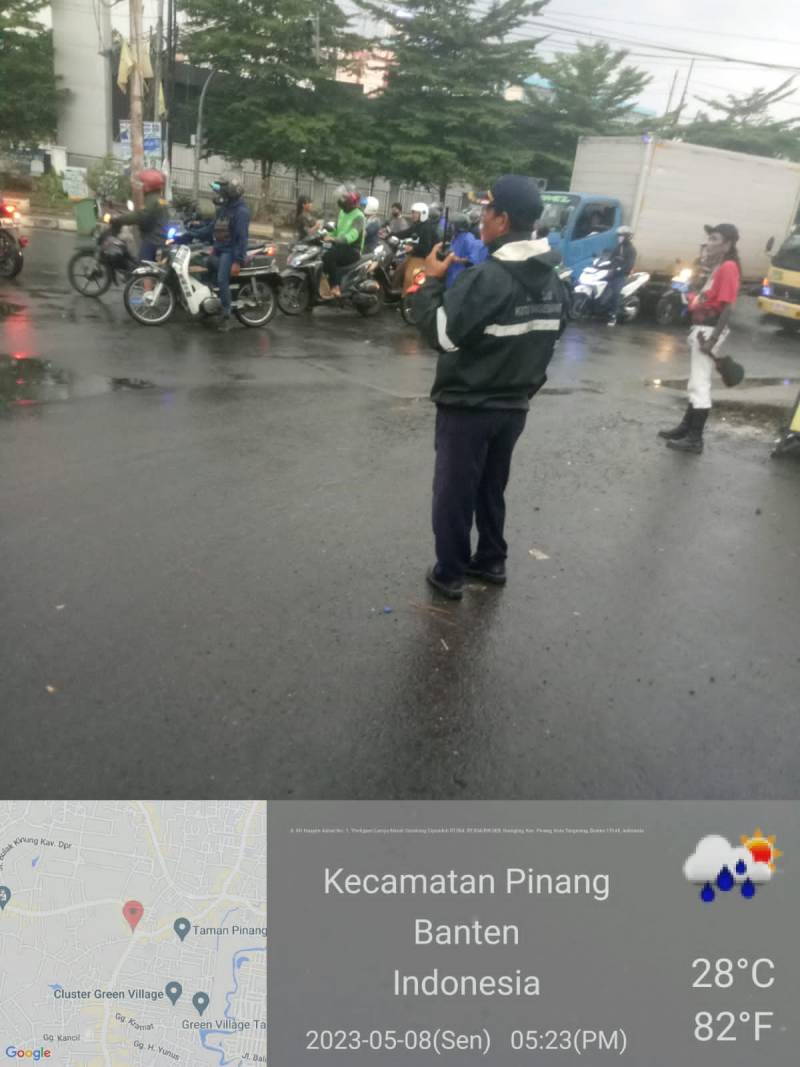 Kota Tangerang, Senin (8/5/23) sore diguyur hujan deras, dan terjadi sejumlah genangan dibeberapa wilayah dan ruas jalan. Siaga dalam penanganan kondisi tersebut, Dinas Perhubungan (Dishub) Kota Tangerang langsung menurunkan ratusan petugasnya ke jalannya, untuk memastikan lalu lintas lancar untuk pengendara.