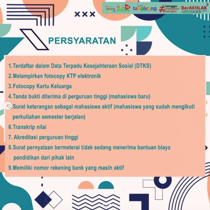 Lanjut Mulyani, untuk mengajukan permohonan atau menerima bansos ini ada sejumlah persyaratan yang perlu dipenuhi. Diantaranya, terdaftar dalam Data Terpadu Kesejahteraan Sosial (DTKS), melampirkan fotocopy e-ktp, fotocopy kartu keluarga, tanda bukti diterima di Perguruan Tinggi bagi mahasiswa baru, surat keterangan sebagai mahasiswa aktif bagi mahasiswa yang sudah mengikuti perkuliahan semester berjalan.