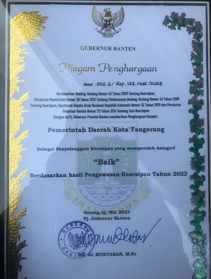 Dinas Perpustakaan dan Arsip Daerah (DPAD) Kota Tangerang baru saja mendapatkan penghargaan Pengawasan Kearsipan Tingkat Provinsi Banten tahun 2022. Penghargaan yang didapatkan adalah kategori “Baik” berdasarkan hasil pengawasan kearsipan tahun 2022.