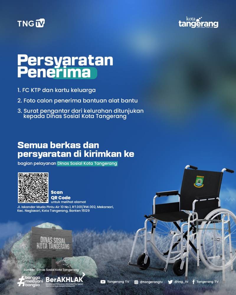 Untuk persyaratannya, dijelaskan Mulyani pemohon harus melengkapi fotocopy KTP dan KK, foto calon penerima bantuan alat bantu, surat pengantar dari kelurahan ditujukan kepada Kepala Dinas Sosial, dan kirim berkas tersebut ke Bagian Pelayanan Kantor Dinsos Kota Tangerang.