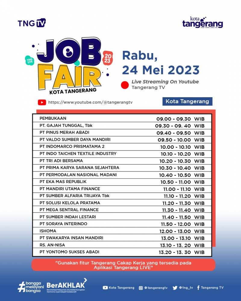 "Bagi para pencari kerja yang ingin mengetahui informasi terkait 18 perusahaan yang membuka lowongan. Seperti, lowongan apa saja yang dibuka, sistem kerjanya, atau bahkan ingin berinteraksi tanya jawab dengan perusahaan yang dituju. Pencari kerja bisa memanfaatkan siaran live streaming channel youtube Tangerang TV mulai pukul 09.00 WIB hingga selesai," jelasnya.