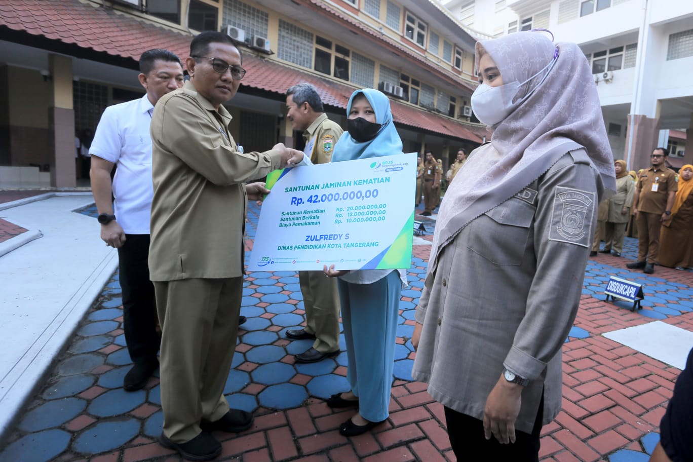 Sekretaris Daerah Kota Tangerang, H. Herman Suwarman, didampingi oleh Asisten Pemerintahan dan Kesejahteraan Rakyat, Deni Koswara, beserta Kepala BPJS Ketenagakerjaan Cabang Cikokol, Zain Setyadi, menyerahkan secara simbolis santunan jaminan kematian senilai Rp. 42.000.000,- dan jaminan kecelakaan kerja senilai Rp. 1.167.000,- kepada perwakilan keluarga Tenaga Harian Lepas (THL) di Lingkup Pemerintah Kota Tangerang saat apel pagi, Senin (24/07).
