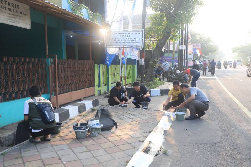 Dalam rangka menyambut kemerdekaan ke-78 RI, Pemerintah Kota (Pemkot) Tangerang menggerakkan seluruh pegawainya untuk melakukan pengecatan kanstin jalan dan juga membersihkan beberapa ruang publik dengan tajuk Jumat Bersih, Jumat (4/8/2023).