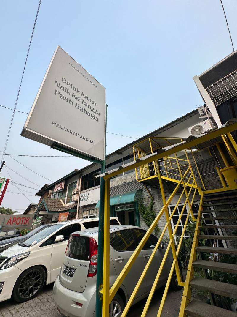 Cafe dengan konsep kekinian, aestetik, unik hingga nyentrik sering kali dicari oleh kaum millenial hingga tua sekalipun, seperti Tangga Bahagia yang memiliki kitchen and bar dengan konsep yang nyentrik yakni retro future minimalis. Tangga Bahagia menjadi salah satu hidden gem di Kota Tangerang, karena terletak di atas apotik yang beralamat di Jalan Taman Hiburan No.5, Sukasari, Kecamatan Tangerang, Kota Tangerang.