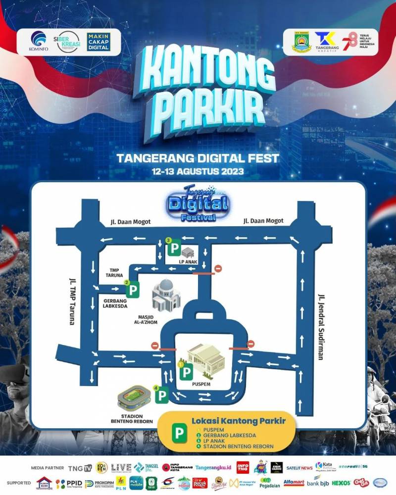 Sebagai informasi, sepanjang pelaksanaan Tangerang Digital Festival 2023, kantong parkir yang disediakan ialah Puspem Kota Tangerang, Gerbang Labkesda, Lapas Anak Kota Tangerang, dan Stadion Benteng Reborn.
