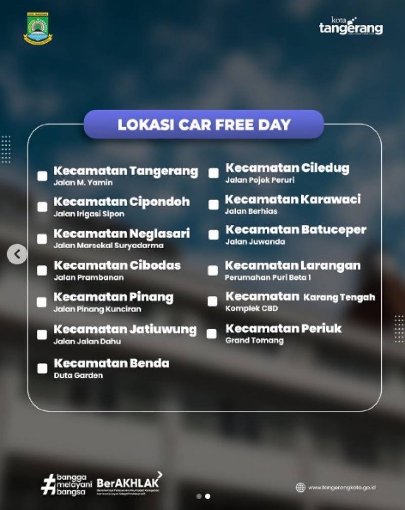 Pemerintah Kota (Pemkot) Tangerang terus berkomitmen melakukan upaya pencegahan polusi udara di Kota Tangerang yang akhir-akhir ini semakin mengkhawatirkan. Salah satunya, Pemkot Tangerang berencana untuk terus menggiatkan program Car Free Day (CFD) yang selama ini telah diselenggarakan di 13 titik lokasi di seluruh Kota Tangerang.