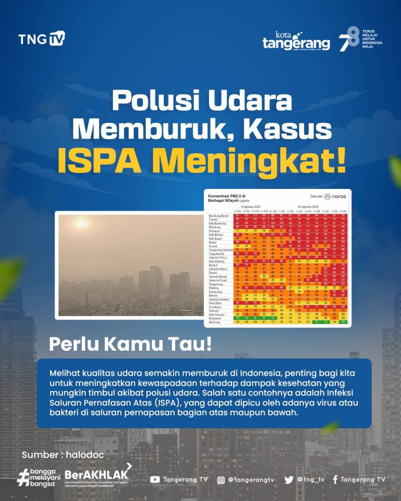 Berdasarkan data Dinas Kesehatan (Dinkes) Kota Tangerang, ditengah isu polusi atau pencemaran udara yang melanda beberapa wilayah Indonesia khususnya Jabodetabek, tercatat di Kota Tangerang saat ini memang mengalami kenaikan pada kasus Infeksi Saluran Pernapasan Akut (ISPA), namun tidak signifikan.