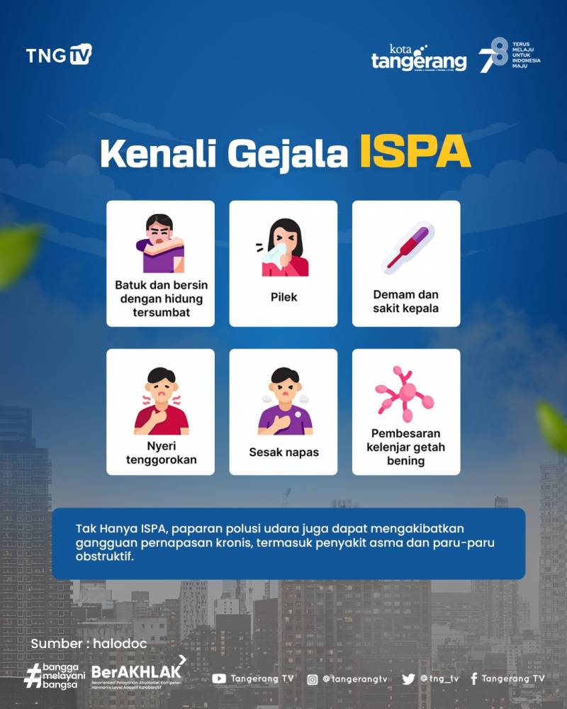 Ia pun menuturkan, setiap orang gejala ISPA beragam tergantung penyebabnya. Bagi orang-orang yang tinggal di kota besar seperti halnya Jakarta atau Kota Tangerang, sebaiknya waspadai gejala-gejala ISPA. Diantaranya, mengalami batuk, suhu tubuh meningkat, nyeri di bagian kepala, sulit bernafas karena hidung tersumbat.