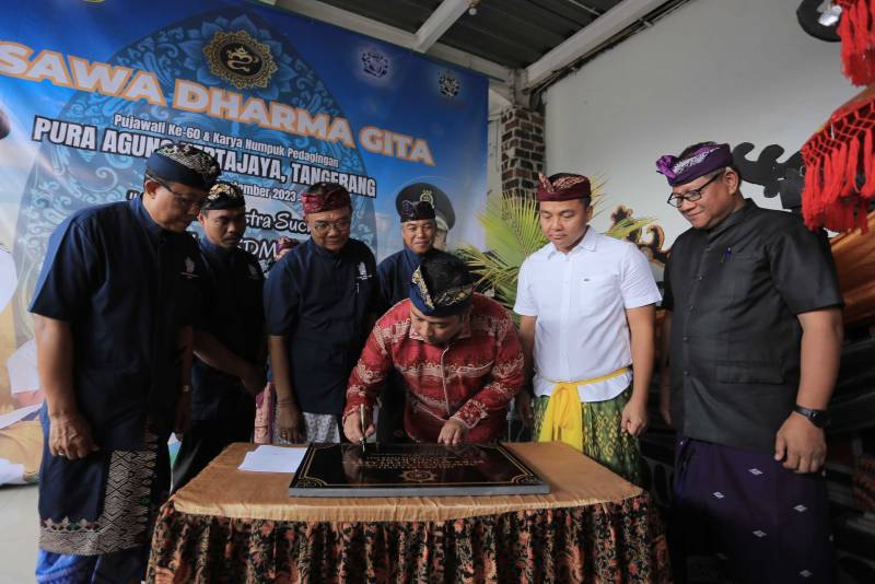 Selain membuka kegiatan Utsawa Dharma Gita tingkat Kota Tangerang yang diikuti oleh anak-anak tingkat TK, SD, SMP hingga SMA, Wali Kota Tangerang bersama dengan Kajari Kota Tangerang juga turut meresmikan dan menandatangani Prasasti dibangunnya Candi Bentar yang ada di Pura Kerta Jaya Kota Tangerang, yang ditandai dengan pemukulan Gong.