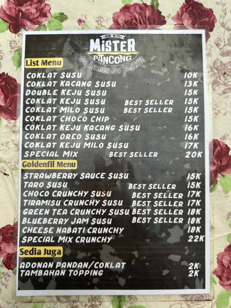 Selanjutnya, Marcello menjelaskan bahwa pancong yang ia jual memiliki beragam topping yang sangat beragam seperti special mix crunchy, special mix, tiramisu crunchy susu, green tea crunchy susu, coklat keju susu, dan coklat milo susu. Tidak hanya topping yang beragam, di Mr. Pancong juga ada adonan original, pandan dan coklat serta dapat request matang atau setengah matang.