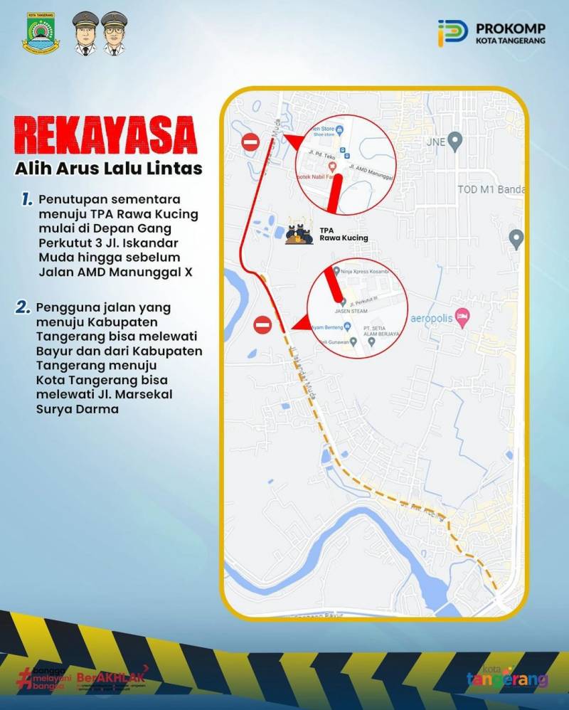 PENGUMUMAN????Dalam rangka penanganan kebakaran dan pendinginan lokasi kebakaran TPA Rawa Kucing, Jl Iskandar Muda akan DITUTUP SEMENTARA.Bagi warga yang akan melintas, dapat menggunakan jalur alternatif. Mohon maaf atas ketidaknyamanannya????????