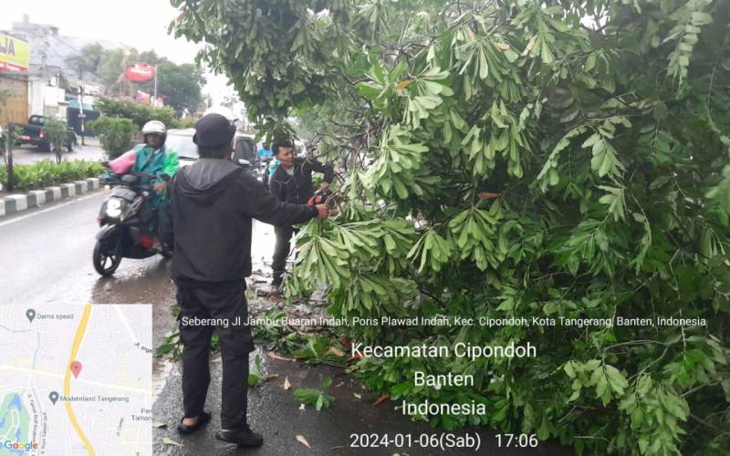 Sejak sekitar pukul 15.00 WIB, wilayah Kota Tangerang dan sekitar diguyur hujan dan angin kencang dengan intensitas waktu yang panjang, Sabtu (6/1/24). Kini, tercatat sejumlah wilayah terjadi genangan hingga banjir, dan banyak terjadinya pohon tumbang. Dalam hal ini, masyarakat diimbau untuk waspada dan berhati-hati pada dampak cuaca ekstrem.