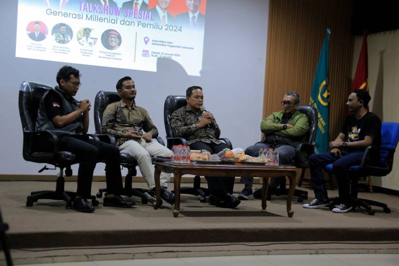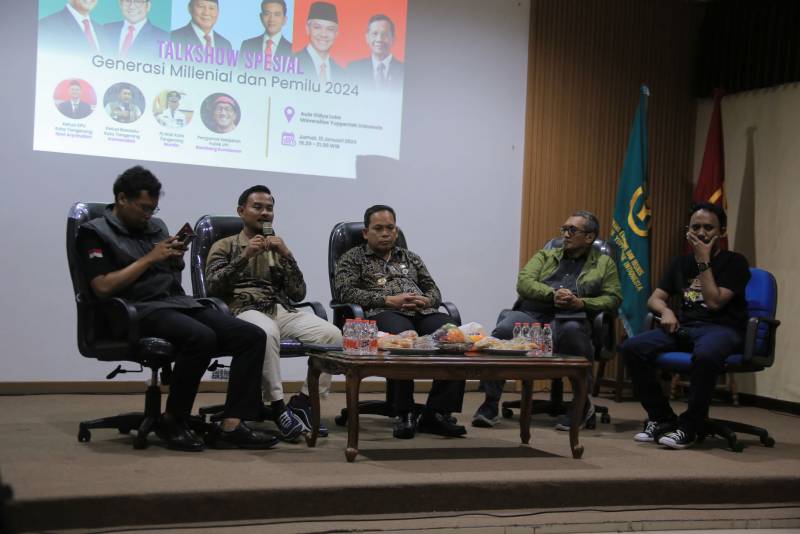 Penjabat (Pj) Wali Kota Tangerang, Nurdin, didaulat sebagai narasumber dalam acara Talkshow Spesial bertajuk Generasi Millenial dan Pemilu 2024 yang digelar di Aula Vidya Loka, Universitas Yuppentek Indonesia (UYI), Jumat malam, (12/01/2024).