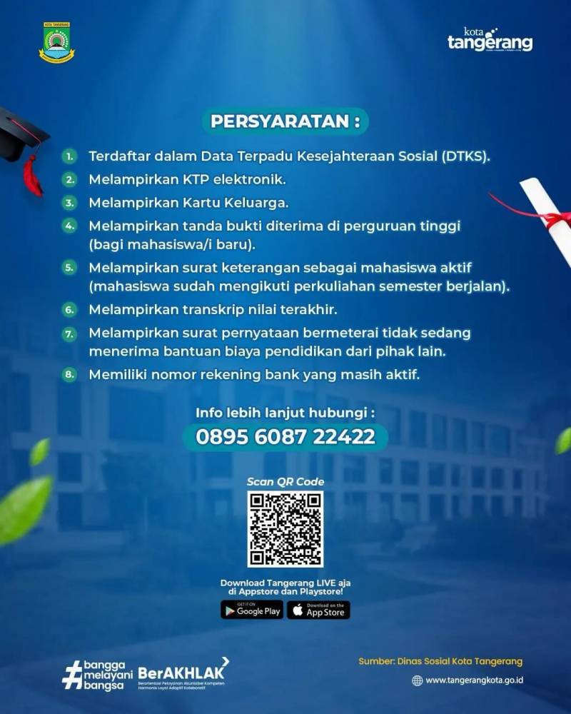 Pemerintah Kota (Pemkot) Tangerang melalui Dinas Sosial (Dinsos) saat ini tengah membuka pendaftaran Bantuan Sosial (Bansos) Beasiswa Perguruan Tinggi, untuk anggaran murni tahun 2025 dengan kuota 300 mahasiswa. Salah satu persyaratannya ialah penerima manfaat harus terdaftar dalam Data Terpadu Kesejahteraan Sosial (DTKS).