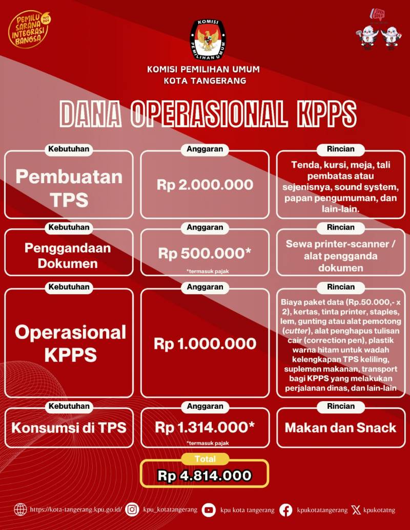 "Kami telah memberikan biaya operasional sejumlah Rp4.814.000 kepada setiap KPPS di 5.175 TPS se-Kota Tangerang. Didampingi juga oleh petugas kepolisian dari Polres Metro Tangerang Kota yang dilakukan di Kantor Sekretaris PPS/Kelurahan," tuturnya.
