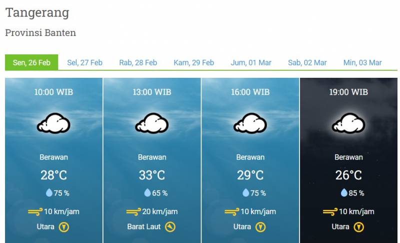 Khusus cuaca di Senin (26/2/24), pagi hingga malam Kota Tangerang akan berawan. Kecepatan 0-20 km/jam. Suhu udara berkisar 25-32 derajat celcius dengan kelembapan udara berkisar antara 55-90 persen.