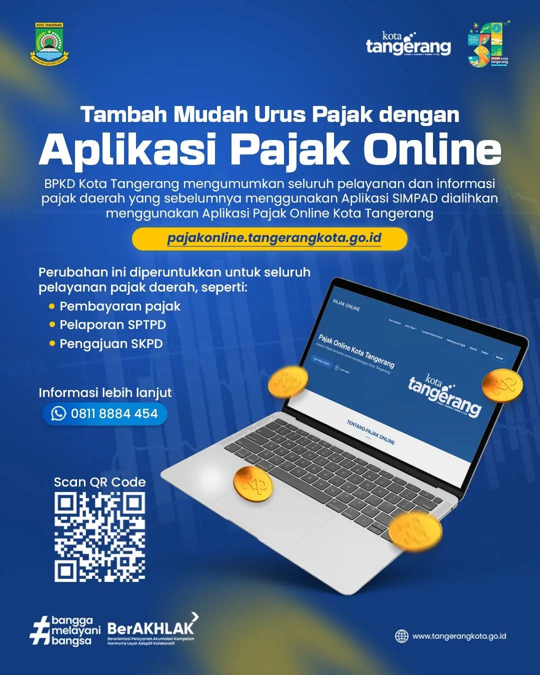 Diinformasikan bahwa dimulai pada 1 Februari 2024, seluruh pelayanan dan informasi pajak daerah dapat diakses menggunakan Aplikasi Pajak Online Kota Tangerang (pajakonline.tangerangkota.go.id) untuk meningkatkan efisiensi pelayanan dan informasi pajak di Kota Tangerang.