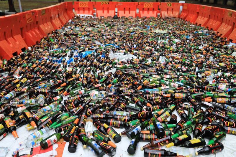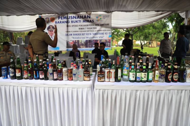 Pada perayaan Hari Ulang Tahun (HUT) ke-31 Kota Tangerang, sebanyak 2.588 minuman keras (miras) dari berbagai merek dimusnahkan di Halaman Pusat Pemerintahan Kota Tangerang, Rabu (28/2/2024).