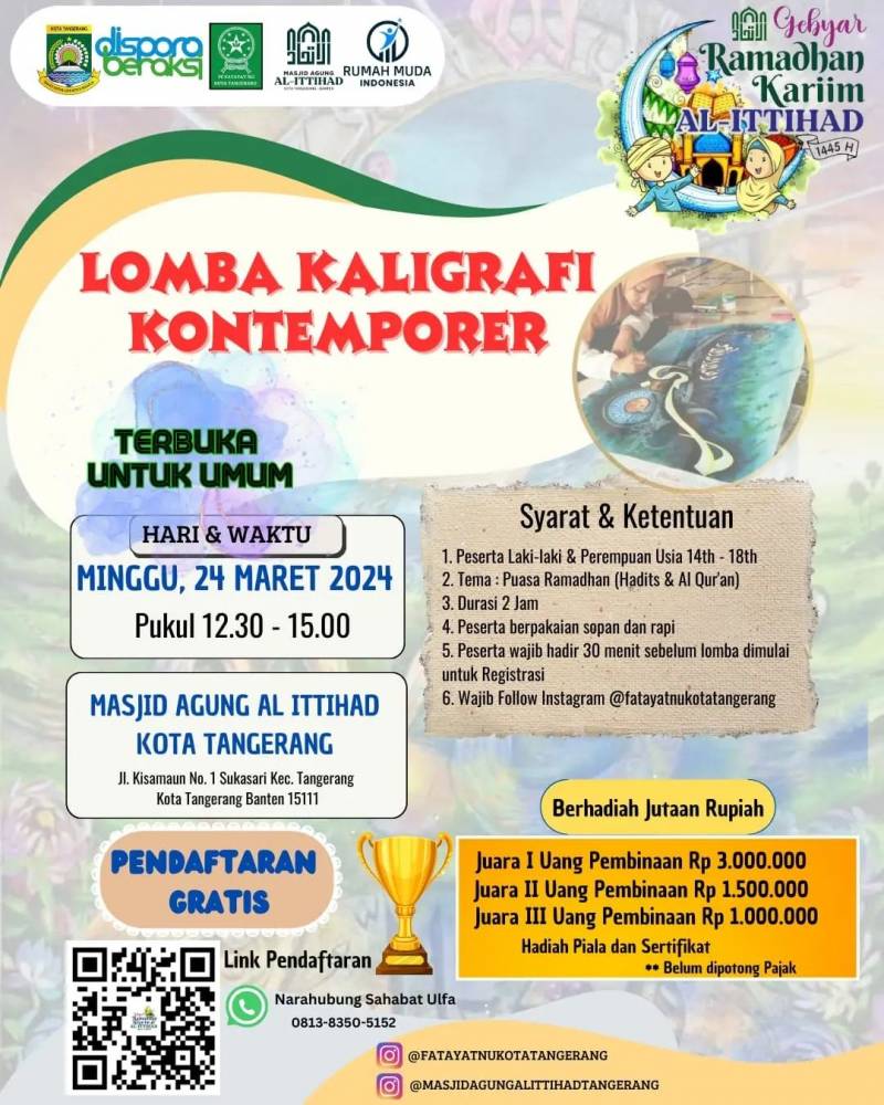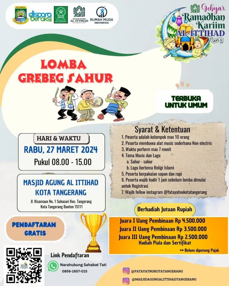 Untuk informasi mengenai serangkaian perlombaan secara lebih lengkap, mulai dari persyaratan pendafataran, mekanisme pendaftaran, sampai jadwal perlombaan dapat dilihat di media sosial Instagram resmi @masjidagungalittihadtangerang dan @fatayatnukotatangerang.