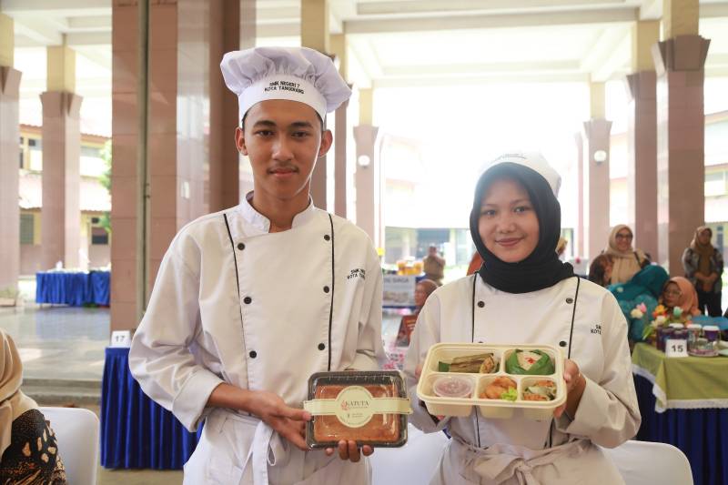 Hal senada juga diungkapkan, Pasya dan Aurel dari SMKN 7 Kota Tangerang. “Pada perlombaan ini, kami membawa nasi, pepes ayam kemangi, urap, puding dan nagget tahu. Tahun lalu, kami berhasil juara 2, semoga tahun ini bisa kembali menaklukkan juara lagi,” seru Pasya.