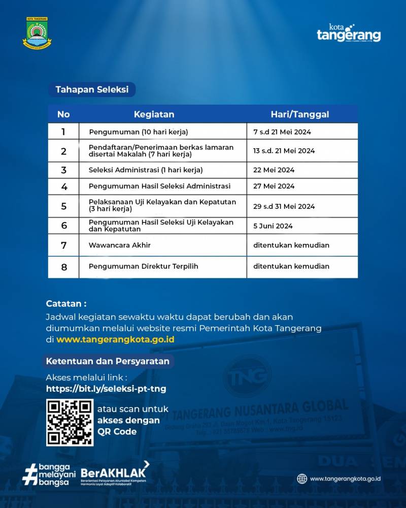 PT Tangerang Nusantara Global (TNG) mengumumkan akan melakukan seleksi terbuka Calon Direktur PT TNG Kota Tangerang periode 2024-2029. Pendaftaran dibuka mulai 13 Mei hingga 21 Mei 2024 hingga pukul 16.00 WIB.