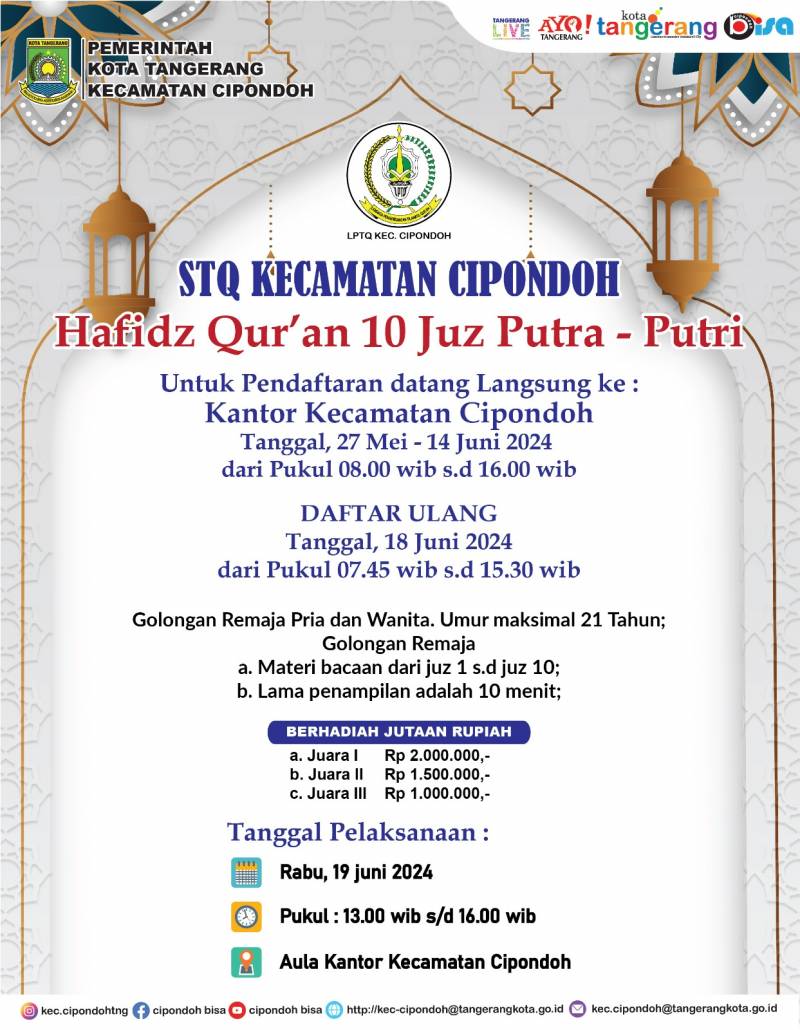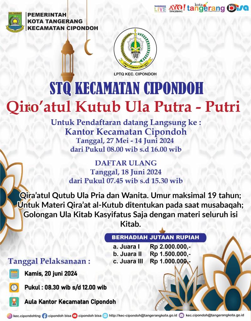 Pemerintah Kecamatan Cipondoh bersama Lembaga Pengembangan Tilawatil Qur’an (LPTQ) Cipondoh kembali menyelenggarakan Seleksi Tilawatil Qur’an (STQ) Tahun 2024. Dilengkapi dengan total hadiah bernilai jutaan rupiah, ajang bergengsi tersebut akan diselenggarakan mulai 19-20 Juni 2024 mendatang.