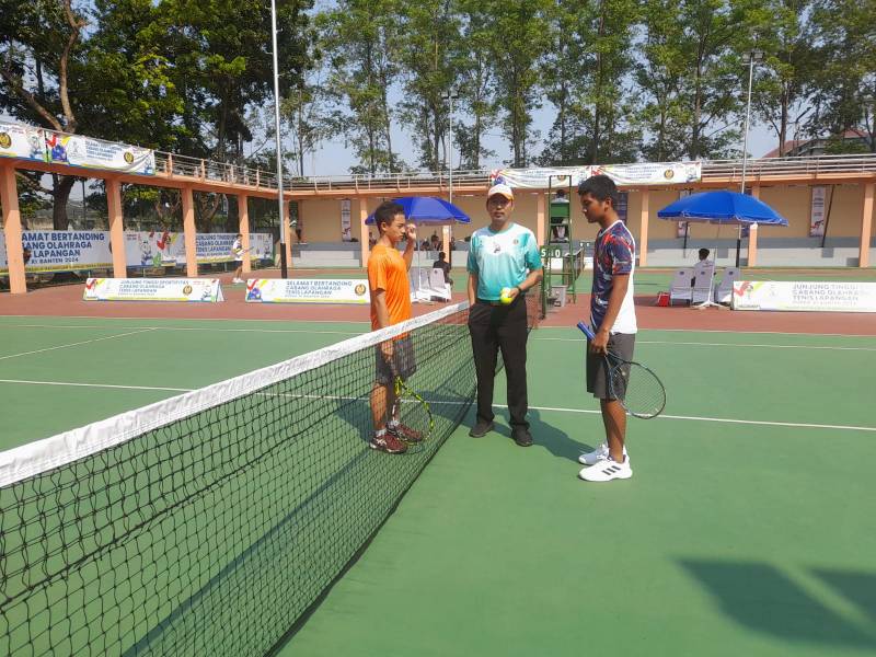 "Hari ini cabor tenis lapangan dimulai dengan pertandingan nomor beregu putra dan putri dengan sistem setengah kompetisi, juaranya dihitung tim yang mendapatkan kemenangan terbanyak," ujarnya.