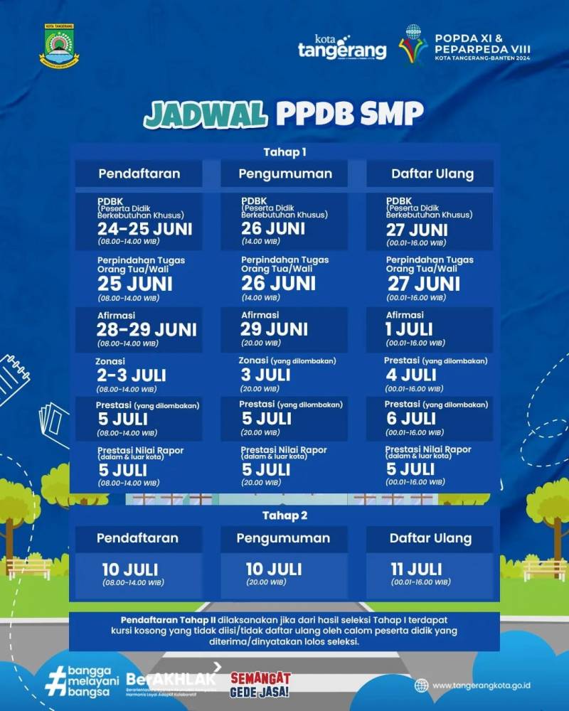 Berikut adalah jadwal pendaftaran PPDB jenjang SMP tahao pertama di Kota Tangerang tahun ajaran 2024/2025