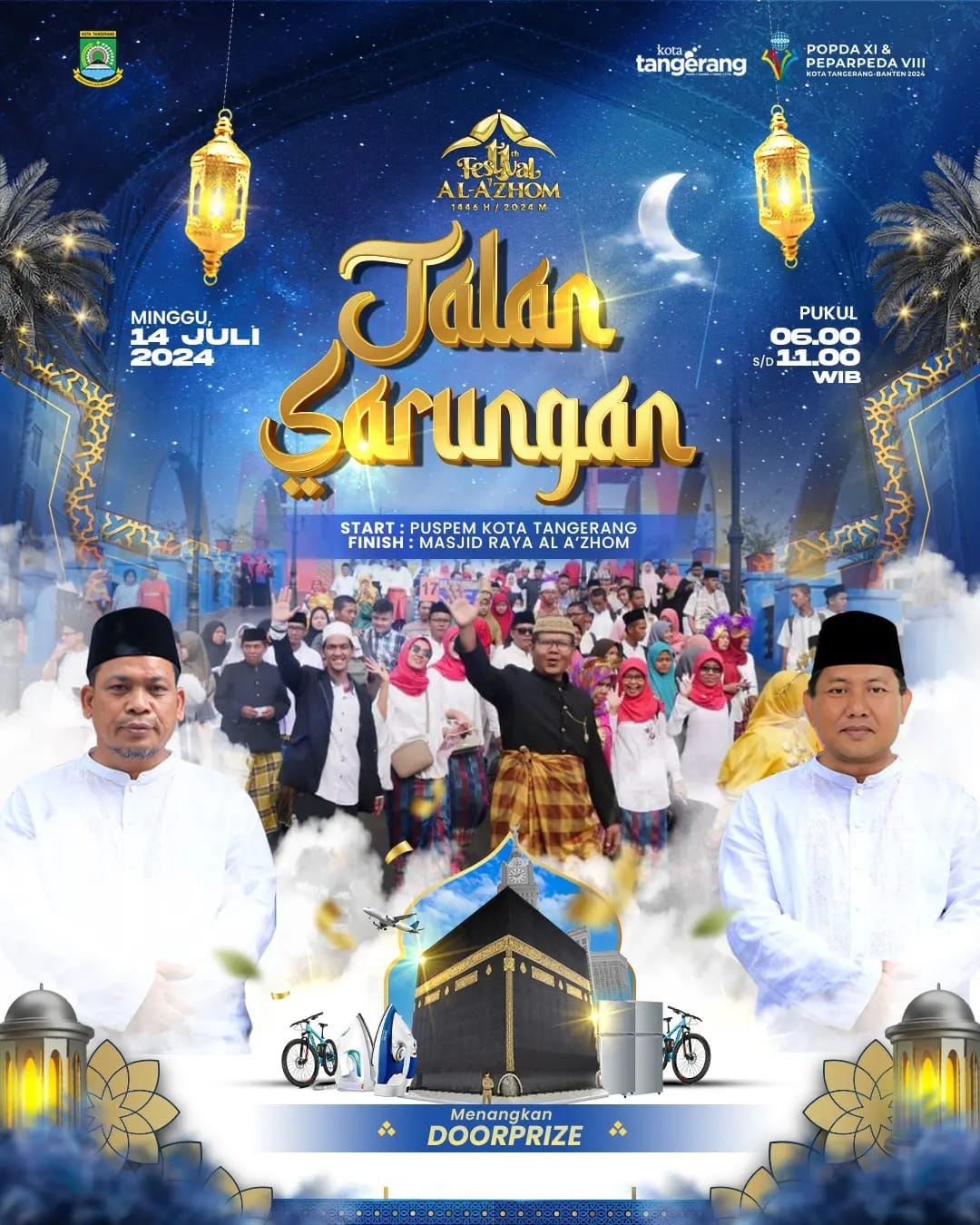 Semarak Festival Al-A’zhom ke-11 2024 Kota Tangerang terus digelorakan. Akhir pekan ini, Pemerintah Kota (Pemkot) Tangerang akan menggelar Jalan Sarungan pada Minggu, 14 Juli 2024, pukul 06.00-11.00 WIB.